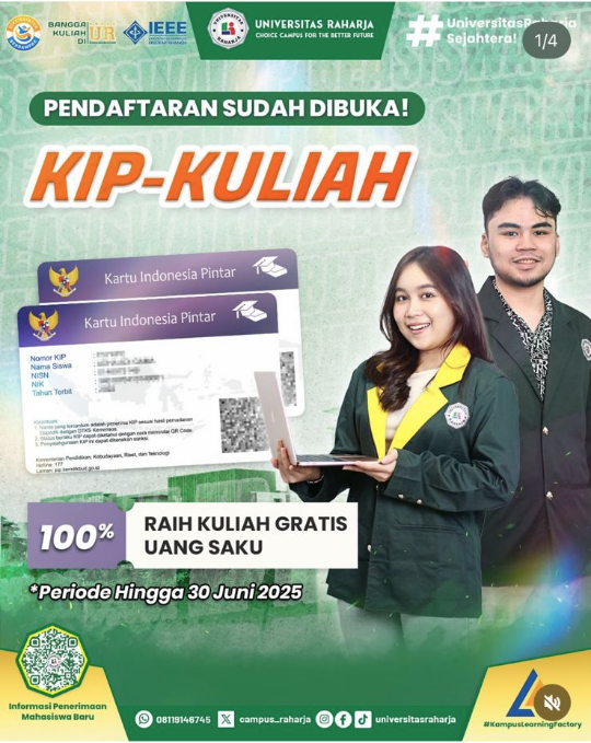 UNIVERSITAS RAHARJA Membuka Jalur Beasiswa KIP-K Tahun 2025 (Intake September 2025) Dengan Menggunakan Seleksi Tes Online Dan Wawancara. Beasiswa KIP-K Diperuntukkan Bagi Siswa Lulusan SMA/SMK/Sederajat Yang Memiliki Potensi Akademik Baik Tetapi Memiliki Keterbatasan Ekonomi Serta Lulus Seleksi Penerimaan Mahasiswa Baru. Jalur Ini Terbuka Untuk Seluruh Siswa Di Indonesia.