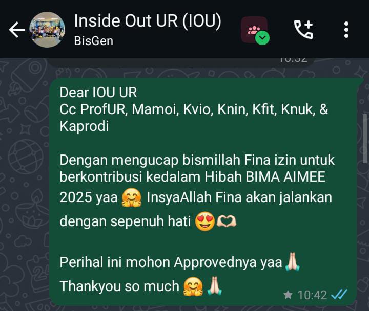 Pada tanggal 12 Maret 2025, Fina bergabung dalam Tim Hibah BIMA AIMEE 2025 bersama KakNin sebagai PIC, Fhia, Fina, dan Sherli. Awalnya Fina sempat ragu karena topiknya kelihatan berat, tapi setelah dijalanin, ternyata seru banget! Fina banyak belajar hal-hal baru, mulai dari proses riset awal, nyusun laporan, sampai diskusi bareng tim buat nentuin strategi pengembangan ide. Meskipun masih belajar, Fina senang karena bisa bantu ngisi bagian-bagian kecil dan bantu nyusun laporan pendukung.