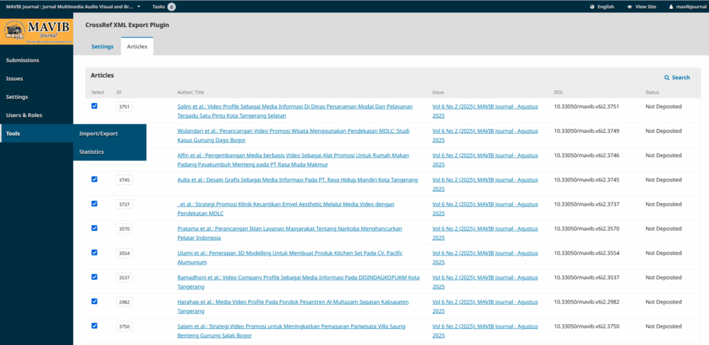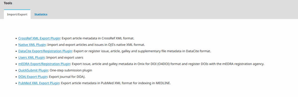 Untuk mendapatkan XML Doi Journal dari Dashboard OJS silahkan ke Menu Tool dan pilih plugin Import/ Export lalu ke CrossRef XML Export Plugin