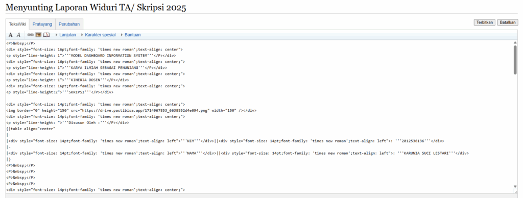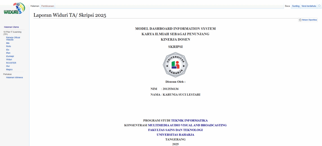 Untuk coding tercepatnya buat yang masih awam dengan percodingan HTML bisa dengan caranya, bisa ke halaman laporan Skripsi saya di link ini : https://widuri.raharja.info/index.php?title=SI1621494026, bisa di sesuaikan dengan format Cover terbaru dari RPU dari coding widuri laporan Skripsi saya bisa ambil saja beberapa coding yang diperlukan. Untuk coding cover terbaru yang telah Kaka sesuaikan dengan format Cover 2025, dan karena cukup masukkan Cover – Abstrak dan Daftar Pustaka kalian di postingan Laporan TA/ Skripsi kalian di widuri, Silahkan copy coding di link ini! : https://widuri.raharja.info/index.php?title=Laporan_Widuri_TA/_Skripsi_2025