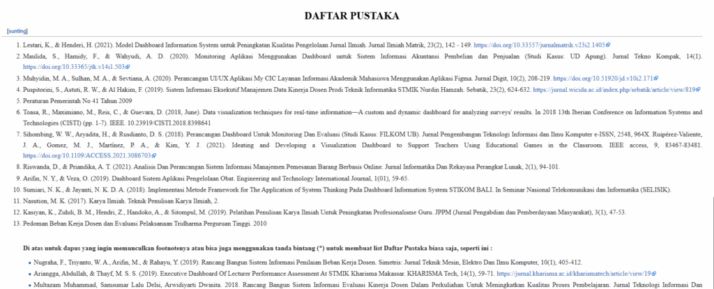 Untuk Daftar Pustaka ada 2 cara, bisa dipilih sesuai dengan kenyamanan kalian sendiri mau yang mana ada yang memunculkan footnote itu bisa menggunakan mulai dengan <ol> coding <li> dan </li> jika semua Daftar Pustaka selesai di copy paste satu-satu akhiri dengan </ol> , serta yang paling sederhana bisa menggunakan tanda bintang (*). Berikut untuk pembeda tampilan jika menggunakan coding list dan tanda bintang (*) bisa cek di bawah ini :