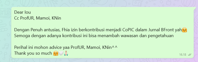 Fhia berkontribusi sebagai Co-PIC dalam kegiatan Jurnal BFRONT pada tanggal 16 April 2025. Dalam perannya, Fhia membantu PIC utama dalam proses submit jurnal, membuat Billy, serta merapikan dokumen IMF. Meskipun sebagai pendamping, kontribusi ini turut mendukung kelancaran proses administratif dan teknis dalam pengelolaan jurnal.