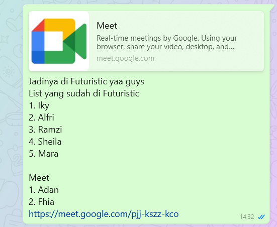 Pada tanggal 24 April 2025, Fhia mengikuti sharing perdana bersama CloveRings CR7, yang secara luring dilaksanakan di ruang Futuristic, Alphabet Incubator. Namun, karena berhalangan hadir secara langsung, Fhia mengikuti kegiatan ini secara daring melalui Google Meet. Pertemuan ini menjadi awal dari proses pengenalan tim serta penyelarasan komunikasi dalam rangka mendukung kegiatan kolaboratif ke depan.