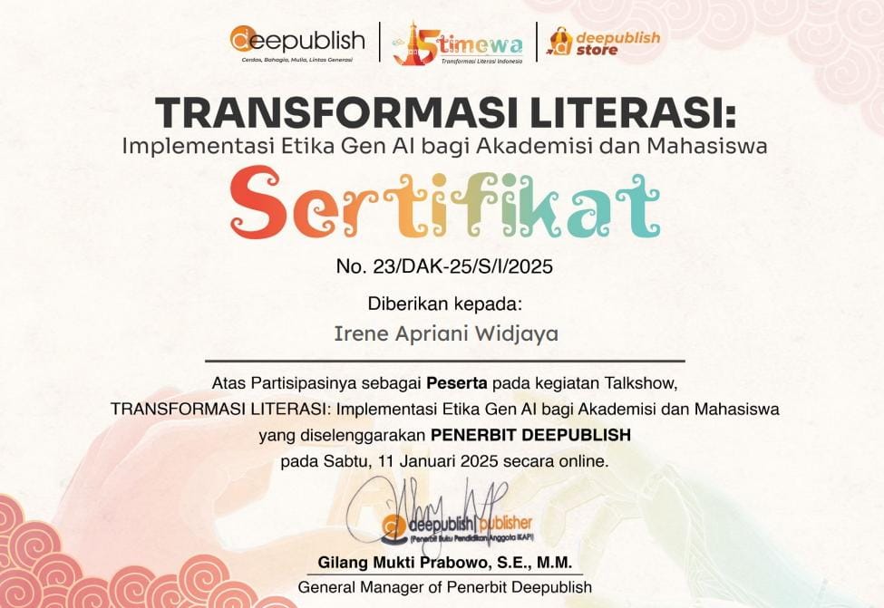 Sebagai seorang mahasiswa yang hidup di tengah arus deras perkembangan digital, Irene merasa sangat bersemangat dan bersyukur bisa mengikuti seminar online yang topiknya “Transformasi Literasi: Implementasi Etika Gen AI bagi Akademisi dan Mahasiswa”. Buat Irene, tema ini penting banget karena sekarang kan lagi gencar-gencarnya teknologi AI yang bisa bikin konten (Gen AI) itu. Nah, AI ini bukan cuma kasih banyak kemudahan dan ide baru, tapi juga bikin kita harus mikir keras soal sisi etisnya. Irene berharap banyak dari seminar ini, supaya Irene dan teman-teman di kampus bisa lebih paham gimana caranya pakai AI ini dengan benar dan tanggung jawab. Penting juga buat kita diskusiin bareng-bareng soal tantangan yang muncul, kayak masalah nyontek pakai AI, AI yang kadang ‘berat sebelah’ (bias), atau soal data pribadi, biar nanti kita bisa nemuin cara-cara nyata buat pakai AI yang sejalan sama nilai-nilai kejujuran, integritas, dan demi kemajuan ilmu pengetahuan yang sehat.