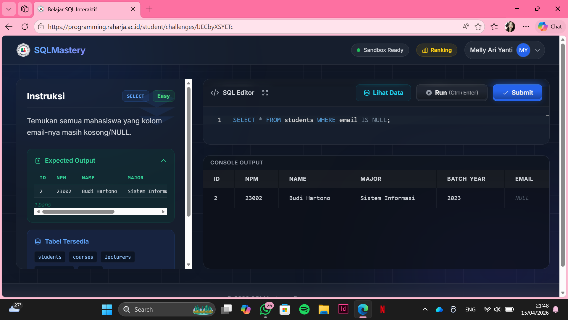 Cermi Kelas Pemrograman Posted by melly ari Categories Home Date 16 April 2026 Comments 0 comment Nama: Melly Ari Yanti NIM: 2421416796 telah menyelesaikan challenge pemrograman week 5, berikut buktinya: Share: melly ari Previous post CERMI Challenges Programming Week 7 16 April 2026 Next post Cermi Kelas Pemrograman 16 April 2026 You may also like isna tasya sabikah 2422417056 mencari data menggunakan pola (like) dan identifikasi baris dengan data kosong (IS NULL /Is NOT NULL) 17 April 2026 Cermi Pemograman 17 April 2026 NAMA : JASMINE AZZAHRA KIRANA RHEMREV NIM : 2421416940 telah menyelesaikan week 5 perhitungan statistik terhadap data menggunakan,COUNT,SUM,AVG,MAX,MIN 17 April 2026 isna tasya sabikah 2422417056 pemrograman challanges 6