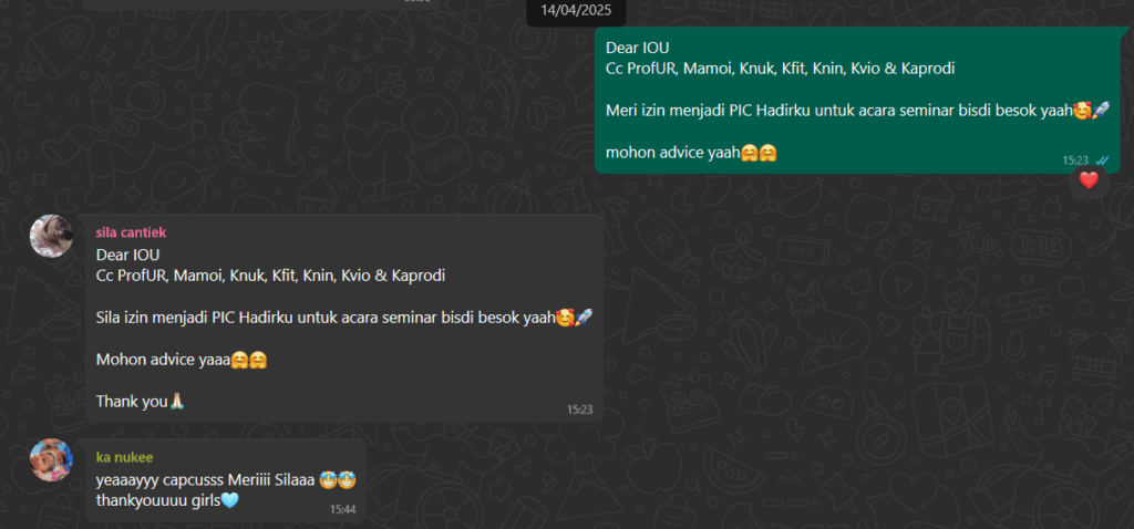 Meri membuat pernyataan pada group IOU (Inside Out UR) untuk berkontribusi ke dalam acara Seminar BisDi yang akan menjadi “Team Hadirku”.