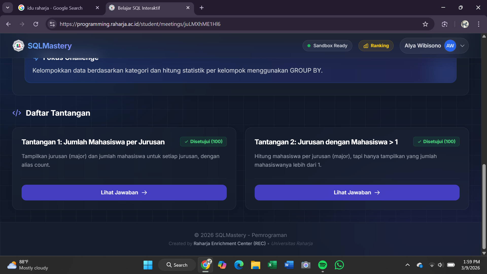 Telah menyelesaikan tugas week 7 Pemrograman II dengan mengerjakan tugas Challenge menggunakan GROUP BY yang sudah diberikan. Berikut buktinya: