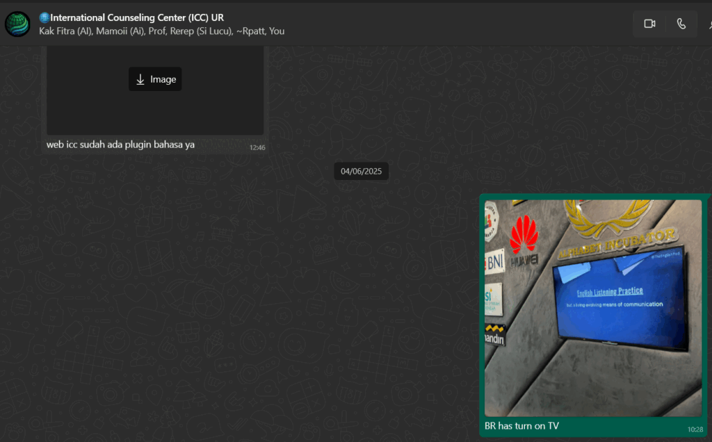 Hari ini, BR kembali menjalankan tugas pentingnya dengan penuh tanggung jawab, yaitu memastikan TV di ruang Future terus memutar video berbahasa Inggris tanpa kendala. Ini bukan kali pertama, tapi BR tetap melakukannya dengan semangat yang sama—karena ia percaya, video-video tersebut bisa menjadi jembatan kecil bagi siapa saja yang ingin lebih akrab dengan Bahasa Inggris.