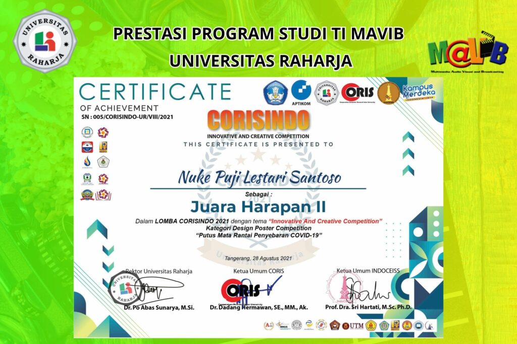 Selamat kepada Nuke Puji Lestari Santoso, mahasiswi Universitas Raharja, yang sukses meraih Juara Harapan 2 dalam ajang Corisindo Competition 2021, kategori Design Poster!