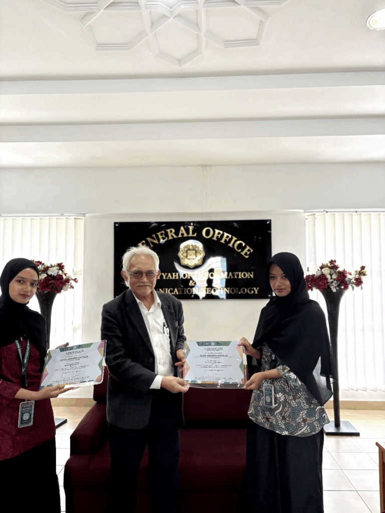 Hari itu menjadi semakin istimewa karena Elisa berkesempatan bertemu langsung dengan Dean of KICT, Prof. Emeritus Dato’ Ts. Dr. Tengku Mohd Tengku Sembok. Sambutan beliau begitu hangat dan penuh inspirasi. Momen ini semakin berkesan ketika Elisa menerima sertifikat Student Exchange secara langsung, sebagai tanda penghargaan atas partisipasi dan perjalanannya dalam program ini. Penerimaan sertifikat tersebut bukan hanya simbol pencapaian, tetapi juga pengingat bahwa setiap langkah belajar dan pengalaman yang dijalani akan menjadi bekal berharga untuk masa depan.