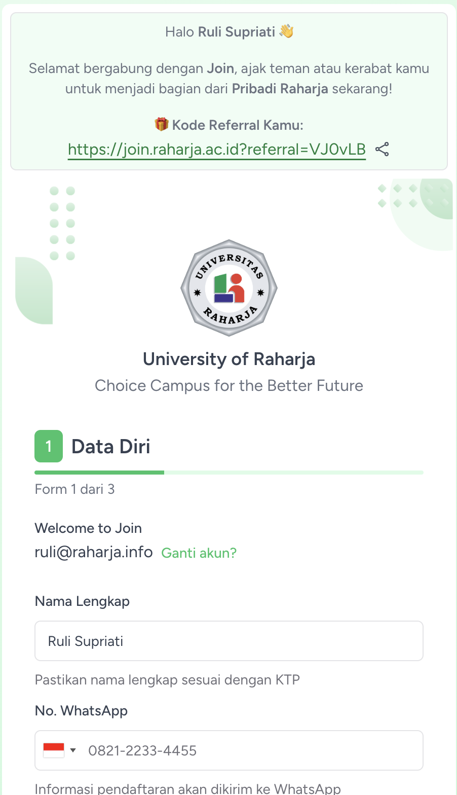 Universitas Raharja, sebagai salah satu perguruan tinggi yang inovatif dan adaptif terhadap perkembangan zaman, selalu berupaya menghadirkan berbagai kemudahan bagi calon mahasiswa baru untuk bergabung. Salah satu inovasi yang menarik adalah adanya Program Join Referral