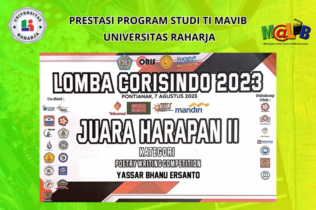 Yassar Bhanu Ersanto, mahasiswa MAVIB Universitas Raharja, berhasil meraih Juara Harapan 2 dalam ajang Corisindo Competition 2023 untuk kategori Penulisan Puisi. Kompetisi ini diselenggarakan oleh STMIK Pontianak, dan diikuti oleh pelajar serta mahasiswa dari berbagai daerah di Indonesia yang memiliki minat dan bakat dalam bidang seni dan sastra.