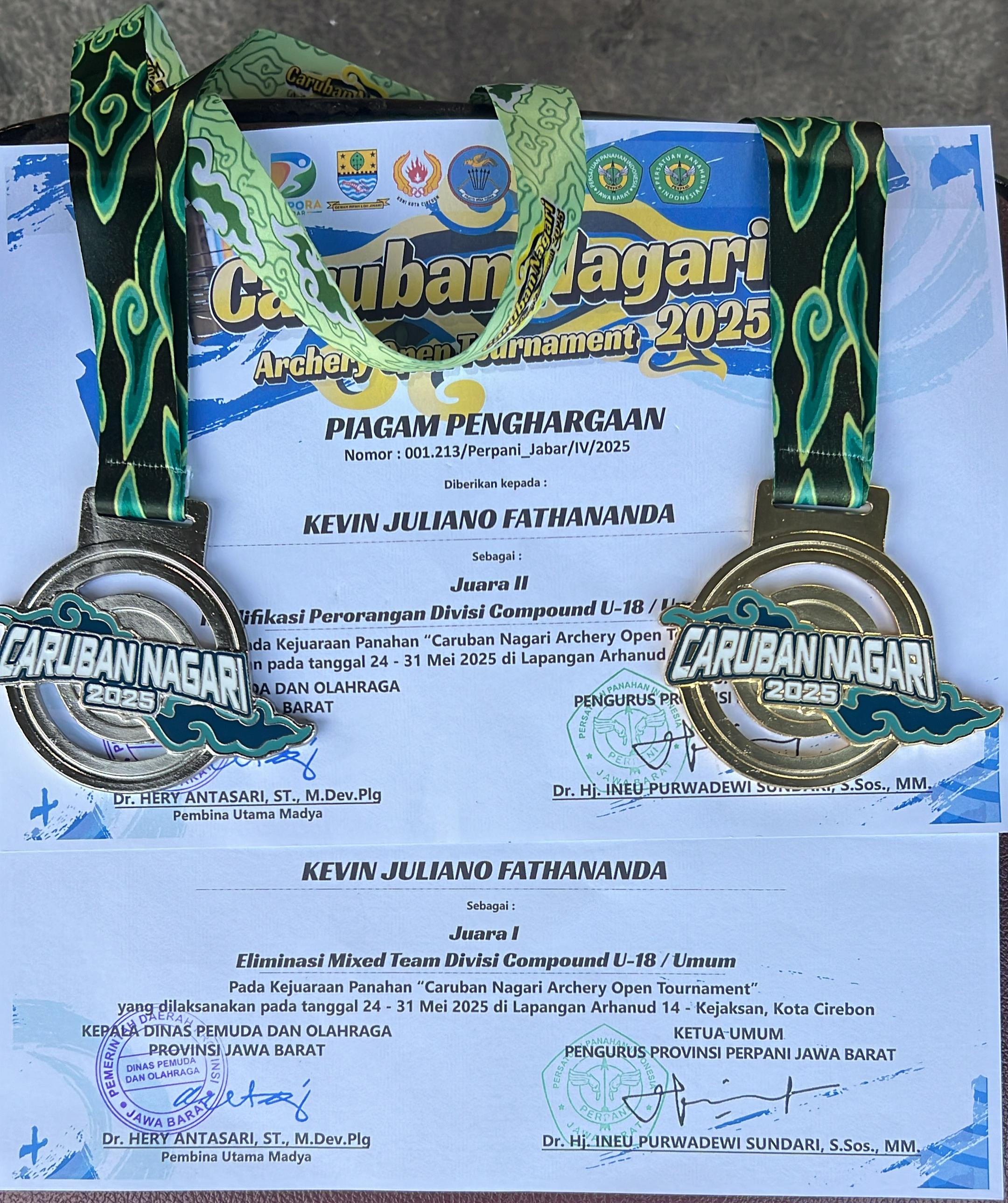 Cirebon, 31 Mei 2025 — Prestasi membanggakan diraih oleh atlet muda panahan, Kevin Juliano Fathananda, dalam ajang bergengsi Caruban Nagari Archery Open Tournament 2025 yang digelar di Lapangan Arhanud 14, Kejaksan, Kota Cirebon pada 24–31 Mei 2025.