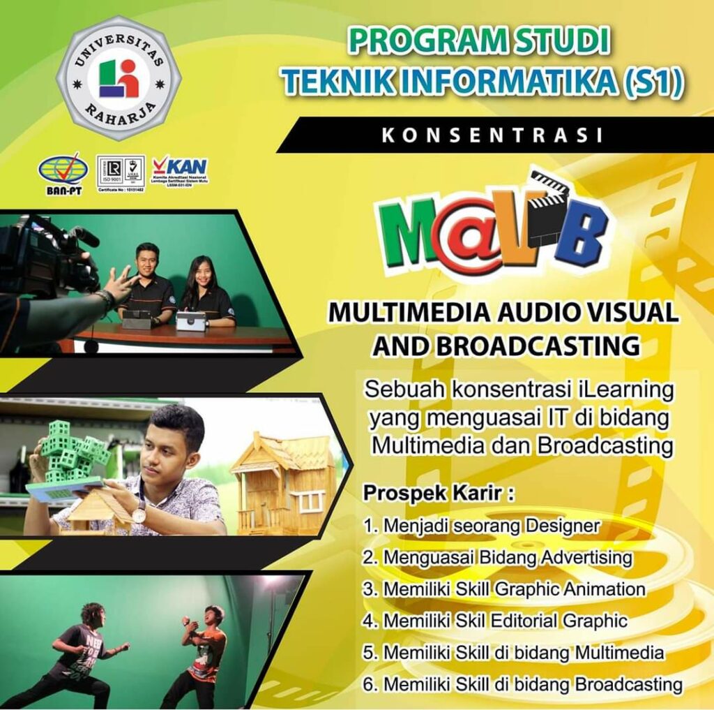 Konsentrasi Multimedia Audio Visual and Broadcasting (MAVIB) merupakan bagian dari Program Studi Teknik Informatika di Universitas Raharja, yang dirancang khusus untuk menjawab kebutuhan industri kreatif digital yang terus berkembang. Program ini menggabungkan teknologi informatika dengan seni dan teknik produksi multimedia, menciptakan lulusan yang unggul di bidang film, animasi, desain grafis, penyiaran, video editing, hingga konten digital interaktif.