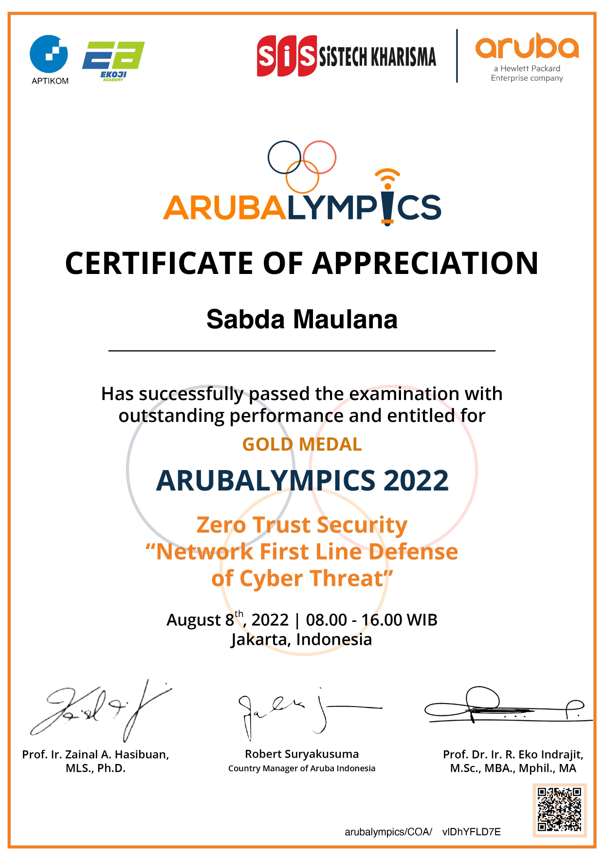 Sabda Maulana berhasil melewati proses ujian ketat dengan performa yang luar biasa, sehingga berhak mendapatkan sertifikat penghargaan yang ditandatangani oleh tiga tokoh penting: Prof. Ir. Zainal A. Hasibuan, MLS., Ph.D., Robert Suryakusuma (Country Manager of Aruba Indonesia), dan Prof. Dr. Ir. R. Eko Indrajit, M.Sc., MBA., Mphil., MA.
