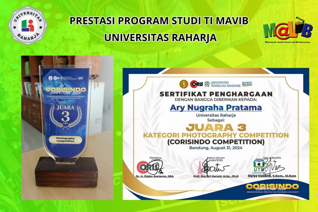 Prestasi membanggakan kembali ditorehkan oleh mahasiswa Universitas Raharja. Ary Nugraha Pratama, mahasiswa Program Studi Teknik Informatika konsentrasi Multimedia Audio Visual and Broadcasting (MAVIB), berhasil meraih Juara 3 dalam ajang Corisindo Competition 2024, pada kategori Photography Competition.