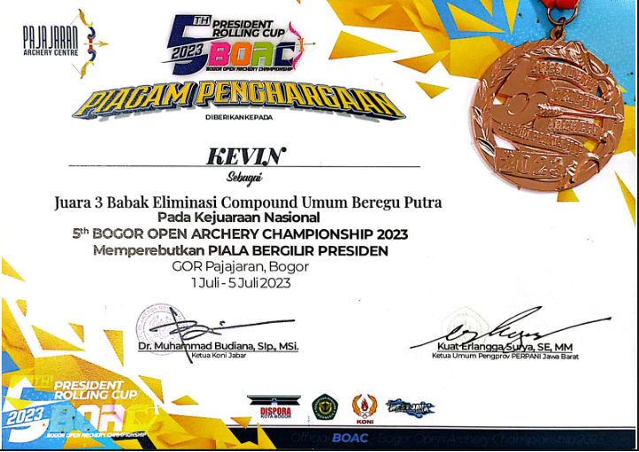 Mahasiswa Universitas Raharja, Kevin Juliano Fathananda, Program Studi Sistem Informasi – Juara 3, Eliminasi Beregu Putra Bogor, 1 Juli – 5 Juli 2023, 5 th President Rolling Cup Bogor Open Archery championship 2023