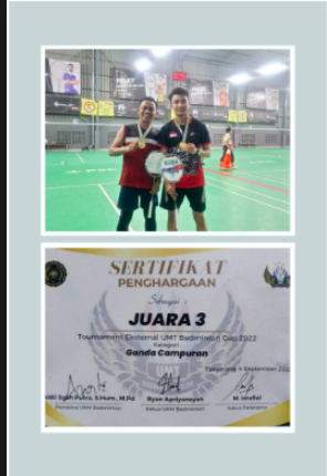 Dua mahasiswa Universitas Raharja, Arindo Bima dan Kurniawa, berhasil mengharumkan nama kampus dengan meraih Juara 3 dalam kategori Ganda Campuran pada Turnamen UMT External Cup Badminton 2022 se-Tangerang Raya. Ajang bergengsi yang digelar pada 4 September 2022 di Tangerang ini mempertemukan para pebulutangkis muda berbakat dari berbagai perguruan tinggi di wilayah Tangerang Raya. Dengan semangat sportivitas dan kerja sama tim yang solid, Arindo dan Kurniawa menunjukkan performa yang membanggakan di setiap pertandingan. Prestasi ini tidak hanya menjadi pencapaian pribadi bagi keduanya, tetapi juga menjadi motivasi positif bagi seluruh mahasiswa Universitas Raharja untuk aktif berprestasi, baik di bidang akademik maupun non-akademik. Universitas Raharja turut memberikan apresiasi atas dedikasi mereka dalam mengharumkan nama institusi di kancah olahraga mahasiswa.