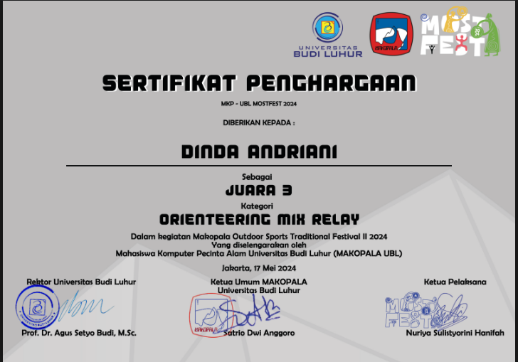 Dinda Andriani, mahasiswa Program Studi Manajemen Retail Universitas Raharja, berhasil menorehkan prestasi membanggakan dalam cabang olahraga orienteering. Pada kompetisi **Orienteering Mix Relay** yang diadakan oleh Universitas Budi Luhur di Jakarta pada 17 Juli 2024, Dinda bersama timnya menunjukkan kemampuan luar biasa dan semangat kerja sama yang tinggi.