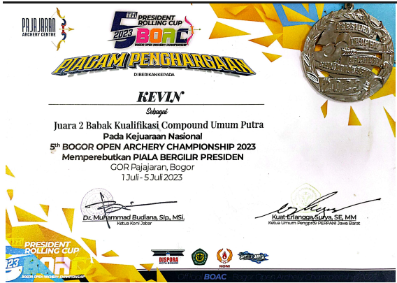Mahasiswa Universitas Raharja,Kevin Juliano Fathananda Sistem Informasi – Sarjana Juara Juara 2, Kualifikasi Umum Putra 1 Juli – 5 Juli 2023 5 th President Rolling Cup Bogor Open Archery championship 2023