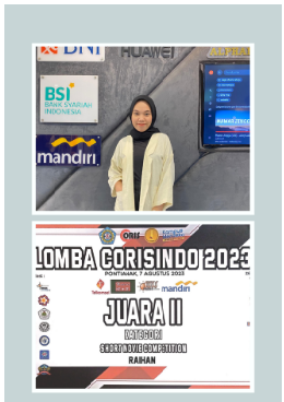 Tim mahasiswa Program Studi Manajemen Retail jenjang Sarjana Universitas Raharja yang terdiri dari Raihan, Yulia Putri Ayu Sanjaya, Sofiyatul Millah, Ora Plane Maria Daeli, dan Agung Yudo berhasil meraih Juara 2 dalam kompetisi Short Movie Corisindo yang diselenggarakan oleh CORISINDO di Pontianak pada 7 Agustus 2023. Prestasi ini merupakan bukti nyata bahwa kreativitas mahasiswa Raharja tidak hanya berkembang di ruang kelas, tetapi juga mampu bersaing di kancah nasional. Dengan mengangkat ide cerita yang kuat, relevan, dan dikemas secara menarik, tim ini berhasil memukau dewan juri dan penonton. Kemenangan ini diharapkan menjadi motivasi bagi mahasiswa lainnya untuk terus mengembangkan potensi, khususnya dalam bidang seni, komunikasi, dan media kreatif. Universitas Raharja bangga atas pencapaian luar biasa ini dan terus mendukung mahasiswanya untuk aktif berkarya di berbagai bidang.