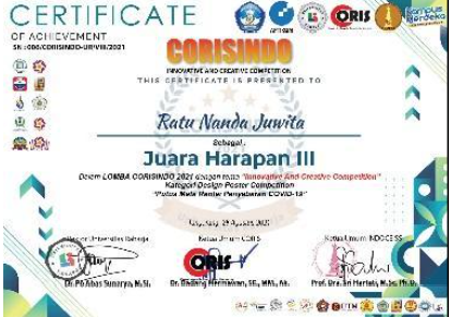 Universitas Raharja kembali mencatatkan prestasi membanggakan melalui mahasiswinya, Ratu Nanda Juwita, dari Program Studi Teknik Informatika. Dalam ajang *Design Poster* yang diselenggarakan di Tangerang pada 28 Agustus 2021, Ratu berhasil meraih **Juara Harapan 3**.