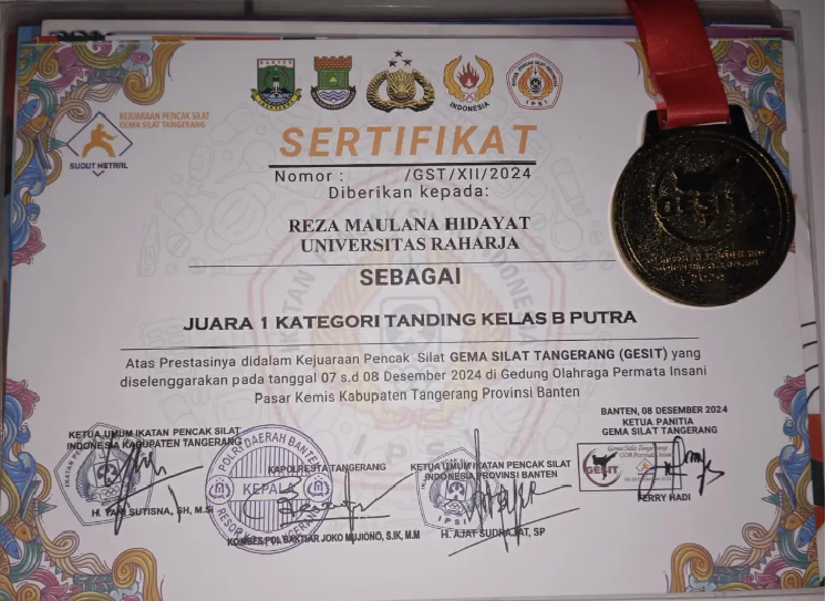 Reza Maulana Hidayat, mahasiswa Program Studi Sistem Komputer Universitas Raharja, kembali menorehkan prestasi gemilang di dunia olahraga. Dalam kejuaraan pencak silat tingkat regional yang digelar di Banten pada 07–08 Desember 2024, Reza berhasil meraih Juara 1 di kategori Tanding Kelas B Putra