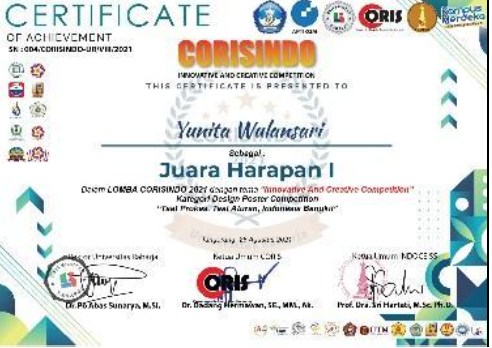 Yunita Wulansari, mahasiswa Program Studi Teknik Informatika Universitas Raharja, kembali mengharumkan nama kampus dengan meraih Juara Harapan 1 dalam ajang lomba Design Poster yang digelar di Tangerang pada 28 Agustus 2021. Kompetisi ini diikuti oleh berbagai peserta dari kalangan mahasiswa dan komunitas kreatif, dengan tema yang mendorong ekspresi visual serta pesan positif bagi masyarakat.