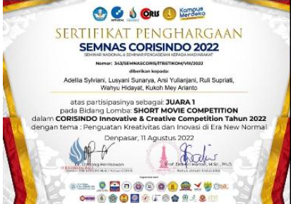 Mahasiswa Universitas Rharja ,Adelia Sylviani, Lusyani Sunarya, Arsi Yulianjani, Ruli SupriatiWahyu Hidayat, Kukoh Mey Arianto Teknik Informatika – Sarjana Juara 1, Short Movie Denpasar, 11 Agustus 2022