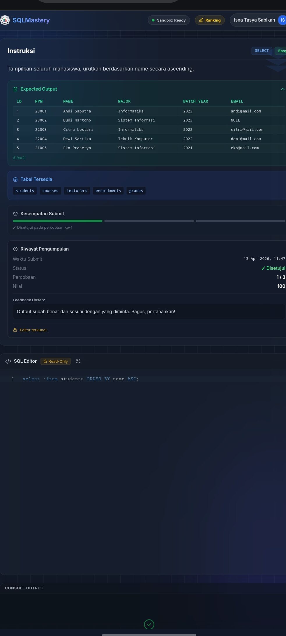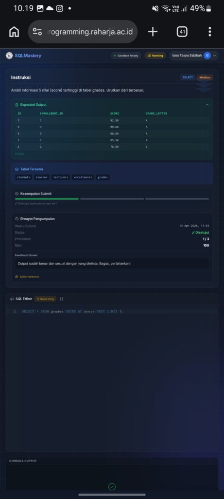 mengurutkan data dan ambil TOP N record menggunakan kombinasi order by limit Posted by isnatasya Categories Home Date 17 April 2026 Comments 0 comment isna tasya sabikah 2422417056 ( tugas pemograman per 5) Share: isnatasya Previous post Cermi Kelas Pemrograman 17 April 2026 Next post Cermi Kelas Pemrograman 17 April 2026 You may also like isna tasya sabikah 2422417056 mencari data menggunakan pola (like) dan identifikasi baris dengan data kosong (IS NULL /Is NOT NULL) 17 April 2026 Cermi Pemograman 17 April 2026 NAMA : JASMINE AZZAHRA KIRANA RHEMREV NIM : 2421416940 telah menyelesaikan week 5 perhitungan statistik terhadap data menggunakan,COUNT,SUM,AVG,MAX,MIN 17 April 2026 isna tasya sabikah 2422417056 pemrograman challanges 6