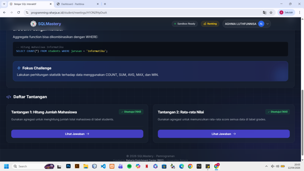 pada pertemuan keenam mempelajari penggunaan aggregate function di SQL seperti COUNT dan AVG untuk menghitung jumlah data dan rata-rata nilai. Fungsi ini bisa digabung dengan WHERE untuk memfilter data.