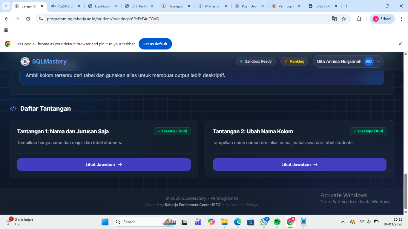 Adapun kolom Alias (AS) yaitu untuk memberikan nama sementara pada kolom agar outputnya jadi mudah dibaca. Contoh, SELECT name AS nama_mahasiswa, nim AS nomor_induk FROM students; dan ada juga Table Alias