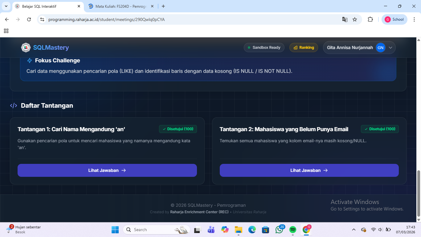 Saya juga telah mempelajari arti dari NULL. NULL adalah data yang tidak diketahui atau belum diisi tetapi bukan berarti nol atau string kosong. NULL tidak bisa dibndingkan dengan = NULL hanya bisa dibandingkan dengan IS. Contoh, SELECT * FROM students WHERE email IS NULL;