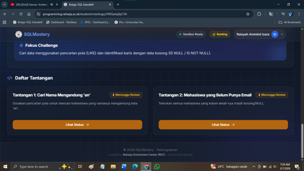 Pada pertemuan ke empat kami mempelajari penggunaan operator LIKE untuk mencari pola tertentu pada data teks di dalam tabel. Operator ini menggunakan wildcard seperti % untuk mewakili nol atau lebih karakter dan _ untuk mewakili satu karakter. Selain itu, kami juga mempelajari tentang NULL, yaitu kondisi ketika suatu data tidak memiliki nilai atau belum diisi. NULL tidak bisa dibandingkan menggunakan operator =, sehingga harus menggunakan IS NULL atau IS NOT NULL untuk melakukan pengecekan data kosong atau data yang sudah terisi.