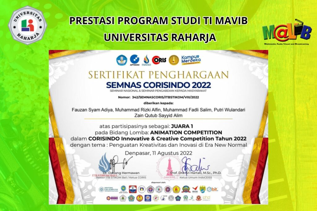 Mahasiswa Program Studi Teknik Informatika – Konsentrasi Multimedia Audio Visual and Broadcasting (MAVIB) Universitas Raharja menunjukkan prestasi luar biasa dalam bidang animasi digital. Pada Corisindo Competition 2022, tim mahasiswa MAVIB berhasil meraih Juara 1 Nasional untuk kategori Animation.