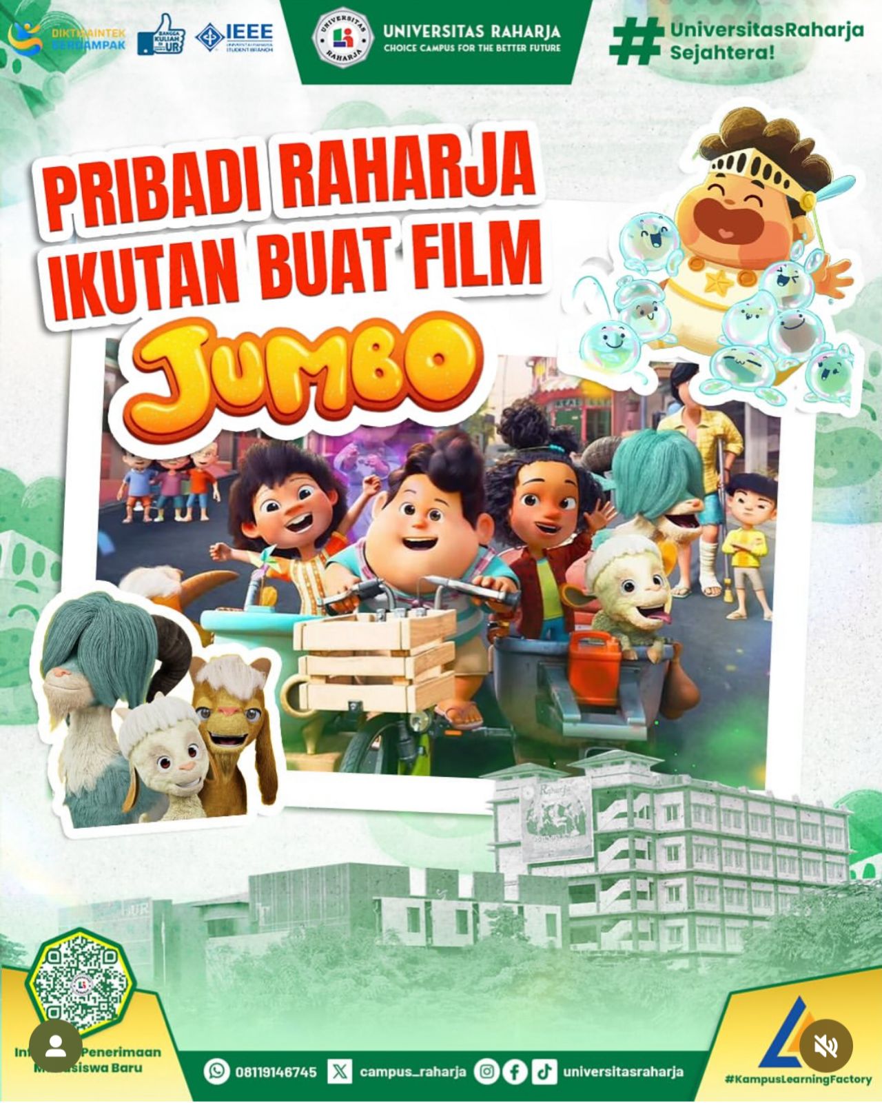Farhan Rachmatullah, Alumni Jurusan Teknik Informatika Konsentrasi Multimedia Audio Visual and Broadcasting Universitas Raharja, ikut berperan sebagai 3D Environment Artist di Film Animasi Lokal Jumbo yang saat tayang booming di 17 Negara.