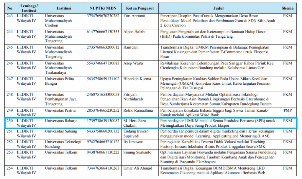 Pengumuman resmi penerima pendanaan PkM Batch II Tahun Anggaran 2025 tertuang dalam surat bernomor 0511/C3/AL.04/2025 yang diterbitkan pada tanggal 22 Juli 2025. Surat tersebut mengacu pada Keputusan Direktur Penelitian dan Pengabdian kepada Masyarakat Nomor 0589/C3/DT.05.00/2025 tanggal 17 Juli 2025 tentang Penerima Pendanaan Program Bantuan Operasional Perguruan Tinggi Negeri Program Pengabdian kepada Masyarakat Batch II Tahun Anggaran 2025. M. Heru Riza Chakim, dengan nomor NUPTK/NIDN 1739738639130082, mengajukan proposal berjudul “Pemberdayaan UMKM melalui Sentra Produksi Bersama (SPB) untuk Meningkatkan Daya Saing Produk Ekspor”. Proposal ini terpilih karena dinilai memiliki relevansi tinggi, inovasi, serta dampak positif yang signifikan bagi peningkatan kapasitas dan daya saing Usaha Mikro, Kecil, dan Menengah (UMKM) di Indonesia.