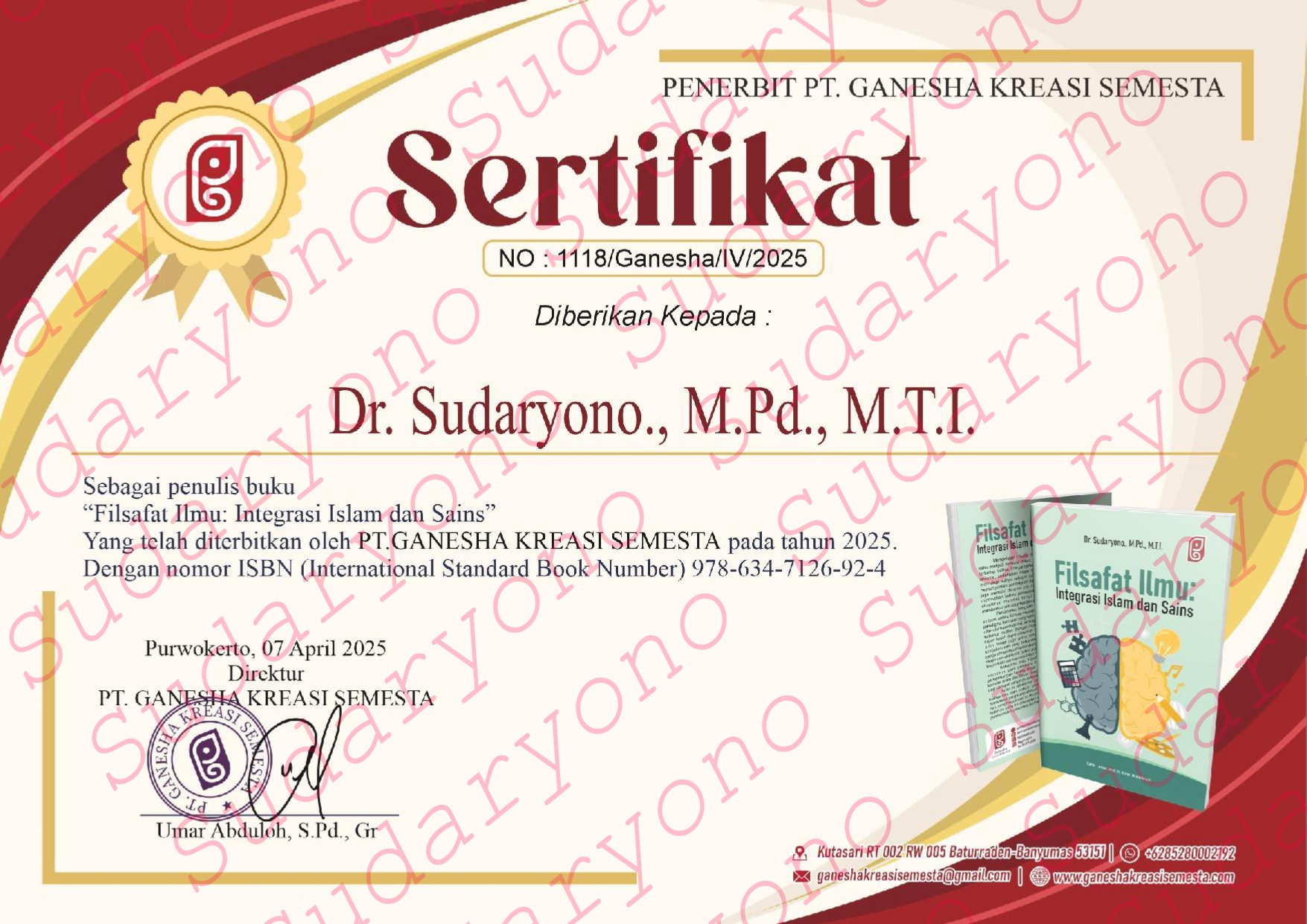 Alamat & kontak penerbit juga tercantum di bagian bawah sertifikat.