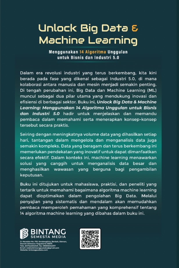 Dalam era revolusi industri yang terus berkembang, kita kini berada pada fase yang dikenal sebagai Industri 5.0, di mana kolaborasi antara manusia dan mesin menjadi semakin penting. Di tengah perubahan ini, Big Data dan Machine Learning (ML) muncul sebagai dua pilar utama yang mendukung inovasi dan efisiensi di berbagai sektor. Buku ini, Unlock Big Data & Machine Learning : 14 Algoritma Unggulan untuk Bisnis dan Industri 5.0 hadir untuk menjelaskan dan memandu pembaca dalam memahami serta menerapkan konsep-konsep tersebut secara praktis.
