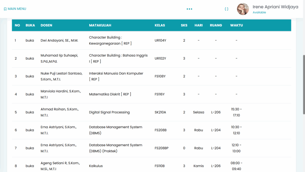 Dan dibimbing oleh para dewan dosen yang hebat dan cerdas, berikut adalah jadwal kuliah Irene serta para dewan dosen yang telah menemani Irene di semester 2 ini: