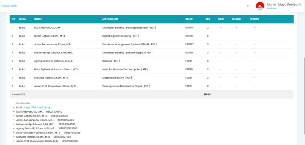 Di semester ini, Maya ambil 8 mata kuliah dengan total 21 SKS yang semuanya dijalani dengan penuh semangat! Setiap mata kuliah membawa pengalaman baru, dan semuanya nggak lepas dari dukungan luar biasa dari para dosen kece yang udah jadi mentor dan pembimbing terbaik.