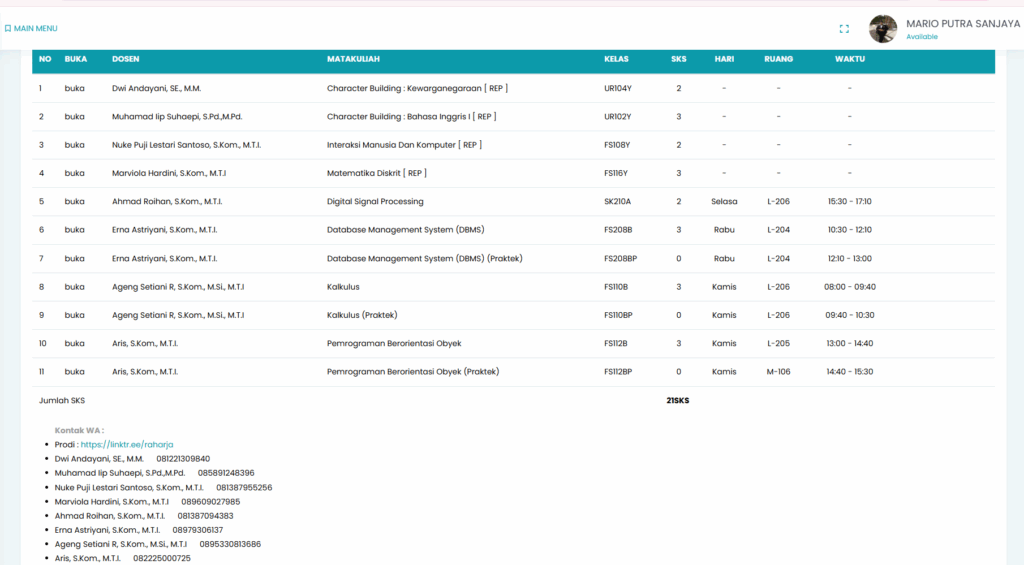 Dengan bimbingan para dosen yang kompeten dan berpengalaman, berikut adalah jadwal perkuliahan Mario beserta nama dosen pengampu yang mendampingi selama semester 2 ini: