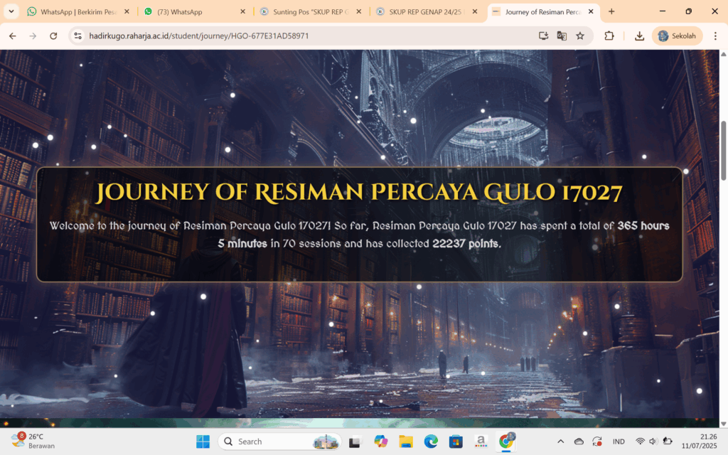Selama semester 2 ini, aku menjalani program yang namanya REP (Raharja Enrichment Program). Di skup ini, aku mau nulis dan ngerangkum kegiatan-kegiatan yang udah aku ikuti selama REP berlangsung. Semuanya jadi bagian dari proses aku belajar dan berkembang bareng teman-teman di Universitas Raharja. Pada pembelajaran REP di semester 2 ini, Resiman telah mengambil 8 mata kuliah (20 SKS) yang telah Resiman tuntaskan dengan penuh semangat.