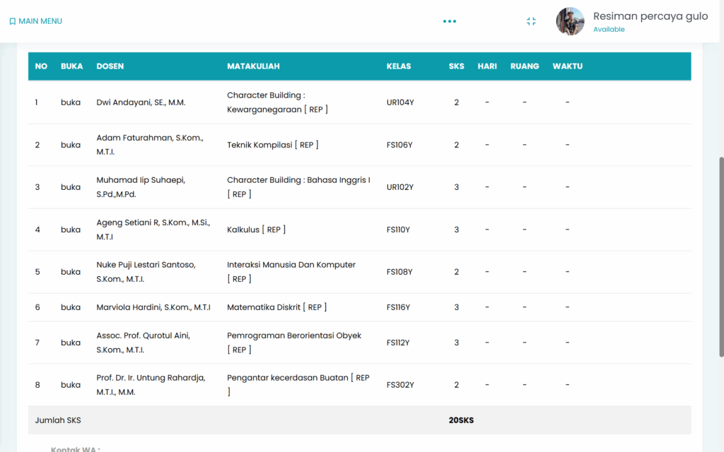 Dan dibimbing oleh para dewan dosen yang hebat dan cerdas, berikut adalah jadwal kuliah Resiman serta para dewan dosen yang telah menemani Resiman di semester 2 ini: