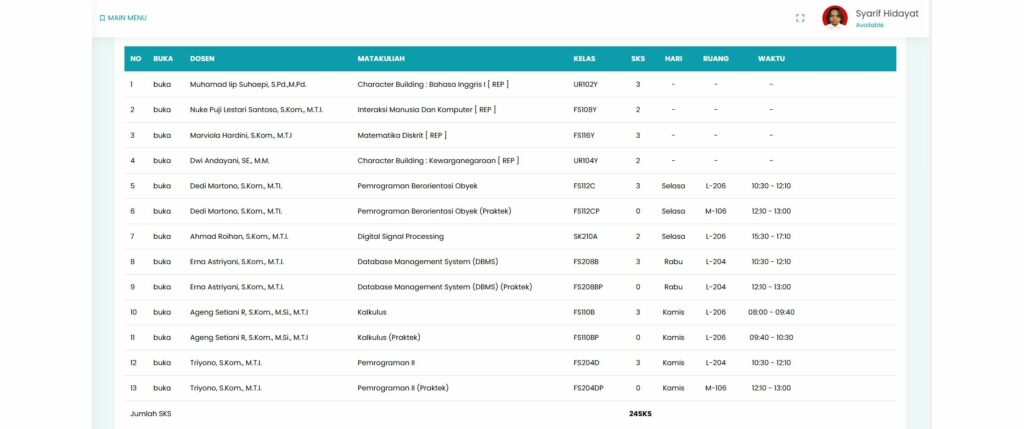 Dan dengan bimbingan para dewan dosen yang aktif, instruktif, informatif, cerdas, dan juga tentunya penyabar dan lapang dada, berikut adalah jadwal kuliah Syarif beserta para dewan dosen yang telah membimbing, menemani, dan juga mengajarkan banyak hal kepada Syarif di semester 2 ini: