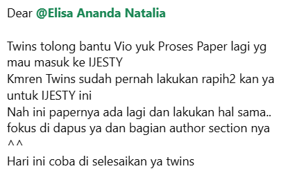 Hari ini aku mendapatkan kesempatan untuk take care 1 paper IJESTY, yang fokus utamanya adalah merapihkan bagian daftar pustaka dan sitasi. Meskipun terlihat sederhana, tapi proses ini cukup detail karena harus memastikan semua referensi sudah sesuai dengan gaya penulisan yang ditentukan, serta mengecek apakah setiap kutipan dalam teks benar-benar tercantum dalam daftar pustaka. Dari aktivitas ini, aku jadi belajar pentingnya konsistensi dalam penulisan ilmiah dan bagaimana tata kelola referensi yang baik bisa meningkatkan kualitas sebuah artikel. Semoga hasil perapihan ini bisa membantu proses publikasi paper berjalan lebih lancar dan rapi sesuai standar jurnal IJESTY.