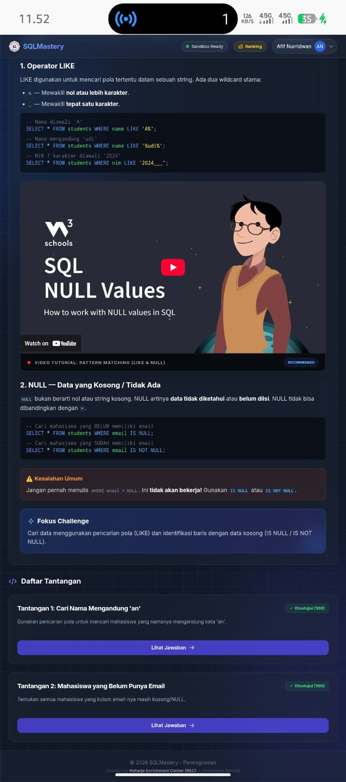 CERMI: Saya Afif Nurridwan, mahasiswa mata kuliah Pemrograman 2 di kelas Pemrograman 2. Pada materi ini saya mempelajari Operator LIKE untuk mencari data berdasarkan pola dan NULL untuk mengetahui data yang kosong. Dari pembelajaran ini saya menjadi lebih paham cara mencari data tertentu dan mengecek data yang belum diisi di dalam database SQL.