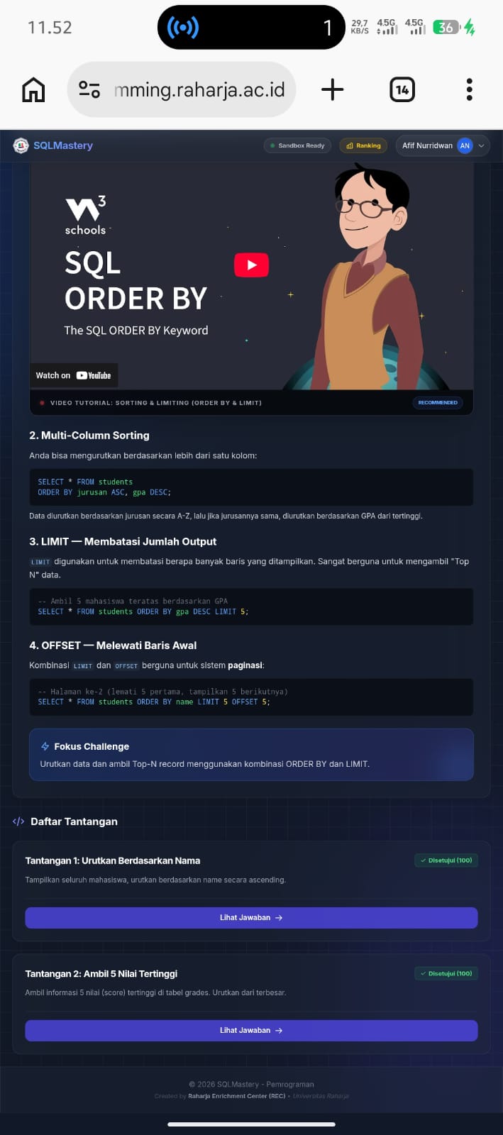 CERMI: Saya Afif Nurridwan, mahasiswa mata kuliah Pemrograman 2. Pada materi ini saya mempelajari penggunaan ORDER BY untuk mengurutkan data, LIMIT untuk membatasi jumlah data yang ditampilkan, dan OFFSET untuk melewati beberapa baris data. Dari pembelajaran ini saya jadi lebih memahami cara menampilkan dan mengatur data pada database SQL.