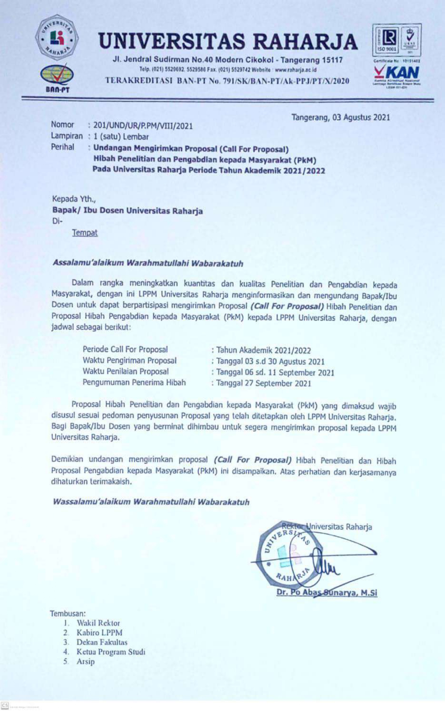 Dalam rangka meningkatkan kuantitas dan kualitas Penelitian dan Pengabdian kepada Masyarakat, dengan ini LPPM Universitas Raharja menginformasikan dan mengundang Bapak/Ibu Dosen untuk dapat berpartisipasi mengirimkan Proposal (Call For Proposal) Hibah Penelitian dan Proposal Hibah Pengabdian kepada Masyarakat (PkM) kepada LPPM Universitas Raharja, dengan jadwal sebagai berikut: