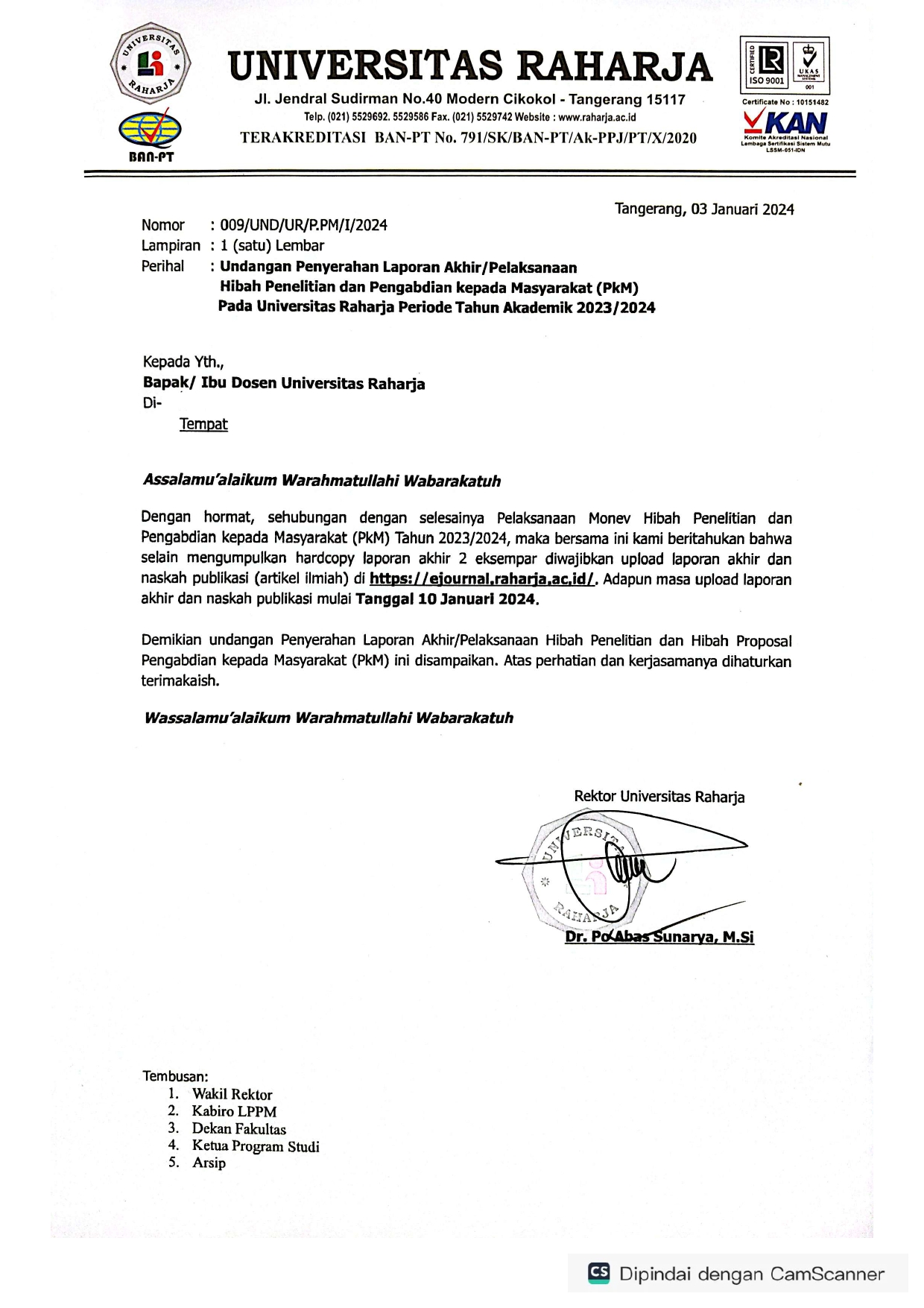 Sehubung dengan monitoring dan evaluasi (Monev) kemajuan Penelitian dan Pengabdian Kepada Masyarakat (PkM) Universitas Raharja Tahun Akademik 2023/2024, dengan hormat mengundang Bapak/Ibu Ketua Pelaksana Penelitian dan Pengabdian Kepada Masyarakat (PkM) untuk melaksanakan monitoring dan evaluasi (Monev) kemajuan yang akan dilaksanakan pada: